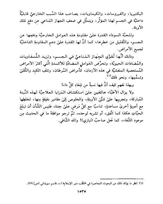 ولا يزال الأطبَّاء عاكفين على استكشاف المَزايا العلاجيَّة لهذه النَّبتة المُباركة، وتجريبِها على شتَّى الأوبئةِ، والخلوص إلى مقادير دقيقةٍ مِنها، لخلطِها مع أدويةٍ أخرى مساعدةٍ، تناسبًا مع كلِّ مَرضٍ على حِدة، فليس الشَّأن أن تبلعَ الحبَّاتِ هكذا كما اتَّفق، أو تشربه لوحده، ثمَّ ترجو موافقةَ ما في الحديث مِن موعود الشِّفاء، كما فَعل صاحبُ (نيازي)! والله الشَّافي.