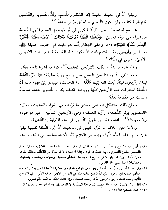 هذا مع استصحاب خبرِ القرآن الكريم في مُوالاةِ خلقِ العِظام لطَورِ المُضغة مباشرةً، في قوله تعالى: {فَخَلَقْنَا الْعَلَقَةَ مُضْغَةً فَخَلَقْنَا الْمُضْغَةَ عِظَاماً فَكَسَوْنَا الْعِظَامَ لَحْماً} [المؤمنون: ١٤]، وخلقُ العِظام إنَّما هو ثابت في حديث حذيفة رضي الله عنه بعد اثنين وأربعين يومًا، فلازم ذلك أنَّ تكون نشأة المُضغةِ قبلَه في تلك الأربعين الأولى، وليس في الثَّالثة (¬٢).