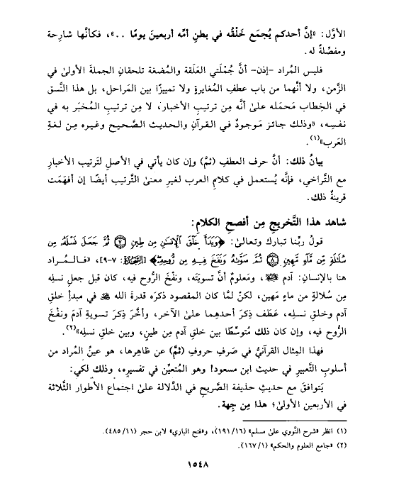 فليس المُراد -إذن- أنَّ جُمْلَتي العَلَقة والمُضغة تلحقانِ الجملةَ الأولى في الزَّمن، ولا أنَّهما من باب عطفِ المُغايرةٍ ولا تمييزًا بين المَراحل، بل هذا النَّسق في الخِطاب مَحمَله على أنَّه مِن ترتيبِ الأخبار، لا مِن ترتيبِ المُخبَر به في نفسِه، «وذلك جائز مَوجودٌ في القرآنِ والحديث الصَّحيح وغيره مِن لغةِ العَرب» (¬١).
