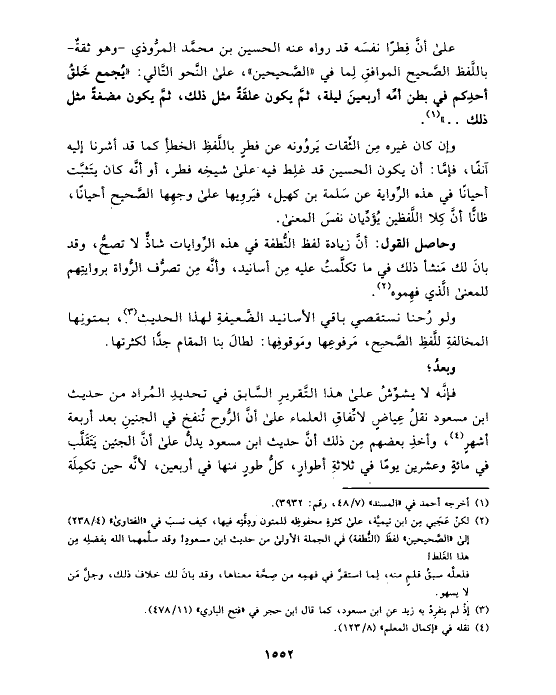 وحاصل القول: أنَّ زيادة لفظ النُّطفة في هذه الرِّوايات شاذٌّ لا تصحُّ، وقد بانَ لك مَنشأ ذلك في ما تكلَّمتُ عليه مِن أسانيد، وأنَّه مِن تصرُّف الرُّواة بروايتِهم للمعنى الَّذي فهِموه (¬٢).