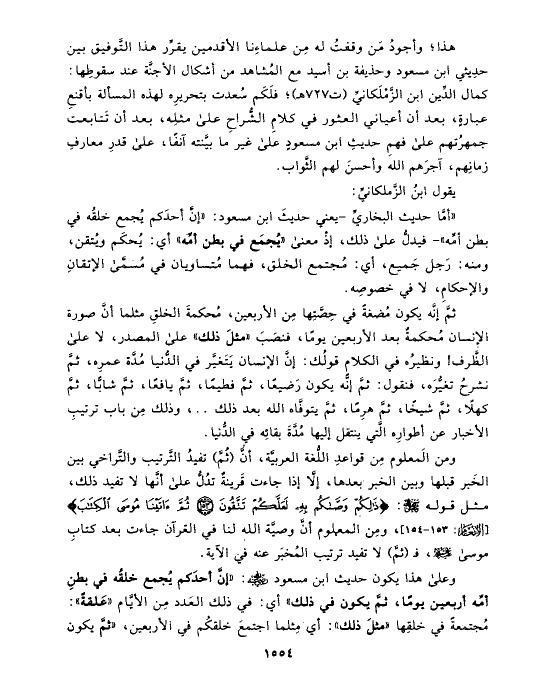 «أمَّا حديث البخاريِّ -يعني حديثَ ابن مسعود: «إنَّ أحدَكم يُجمع خلقُه في بطن أمِّه» - فيدلُّ على ذلك، إذْ معنى «يُجمَع في بطن أمِّه» أي: يُحكَم ويُتقن، ومنه: رَجل جَميع، أي: مُجتمع الخلق، فهما مُتساويان في مُسمَّى الإتقانِ والإحكامِ، لا في خصوصِه.