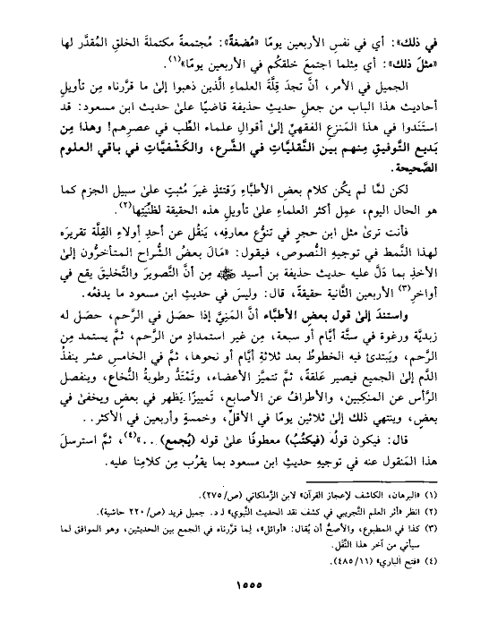 فأنت ترى مثل ابن حجرٍ في تنوُّع معارفِه، يَنقُل عن أحدِ أولاءِ القِلَّة تقريرَه لهذا النَّمط في توجيهِ النُّصوص، فيقول: «مَالَ بعضُ الشُّراح المتأخرُّون إلى الأخذِ بما دَلَّ عليه حديث حذيفة بن أسيد رضي الله عنه مِن أنَّ التَّصويرَ والتَّخليقَ يقع في أواخرِ (¬٣) الأربعين الثَّانية حقيقةً، قال: وليسَ في حديثِ ابن مسعود ما يدفعُه.