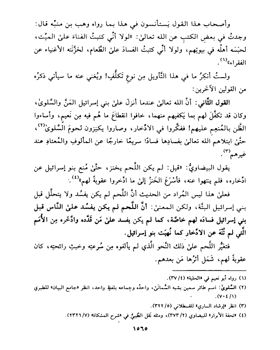 فعلى هذا ليس المُراد من الحديث أنَّ اللَّحم لم يكن يفسُد ولا يتحلَّل قبل بني إسرائيل البتَّة، ولكن المعنى: أنَّ اللَّحم لم يكن يفسُد على النَّاس قبل بني إسرائيل فسادَه لهم خاصَّة، كما لم يكن يفسد على مَن قَدَّده وادَّخَره مِن الأُمَم الَّتي لم تُنْهَ عن الادِّخار كما نُهيَت بنو إسرائيل.