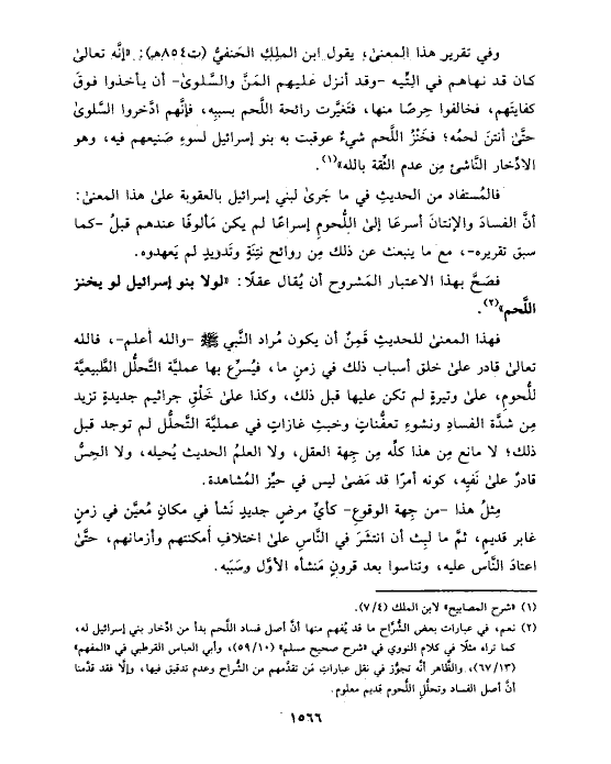 (¬٢) نعم، في عبارات بعض الشُّرَّاح ما قد يُفهم منها أنَّ أصل فساد اللَّحم بدأ من ادِّخار بني إسرائيل له، كما تراه مثلًا في كلام النووي في «شرح صحيح مسلم» (١٠/ ٥٩)، وأبي العباس القرطبي في «المفهم» (١٣/ ٦٧)، والظَّاهر أنَّه تجوُّز في نقل عباراتِ مَن تقدَّمهم من الشُّراح وعدم تدقيق فيها، وإلَّا فقد قدَّمنا أنَّ أصل الفساد وتحلُّلِ اللُّحوم قديم معلوم.