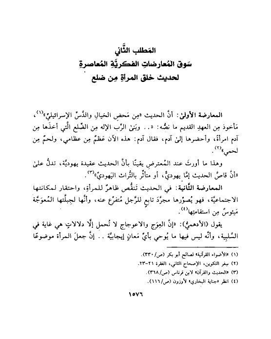 المعارضة الثَّانية: في الحديث تَنقُّص ظاهرٌ للمرأةِ، واحتقار لمكانتها الاجتماعيَّة، فهو يُصوِّرها مجرَّدَ تابعٍ للرَّجل مُتفرِّع عنه، وأنَّها لجِبلَّتها المُعوَجَّة مَيئوسٌ مِن استقامتِها (¬٤).