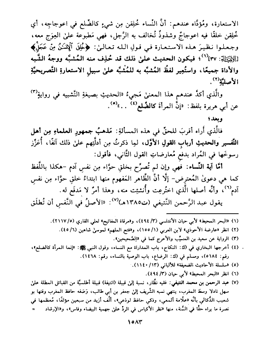 الاستعارة، ومُؤدَّاه عندهم: أنَّ النِّساء خُلِقن مِن شيءٍ كالضِّلع في اعوجاجِه، أي خُلِقن خلقًا فيه اعوجاجٌ وشذوذٌ تُخالف به الرَّجل، فهي مَطبوعة على العِوَج معه، وجعلوا نظيرَ هذه الاستعارة في قولِ الله تعالى: {خُلِقَ الإِنسَانُ مِنْ عَجَلٍ} [الأنبياء: ٣٧] (¬١)؛ فيكون الحديث على ذلك قد حُذِف منه المُشبَّه ووجهُ الشَّبه والأداة جميعًا، واستُعِير لفظُ المُشبَّه به للمُشبَّه على سبيلِ الاستعارةِ التَّصريحيَّةِ الأصليَّةِ (¬٢).