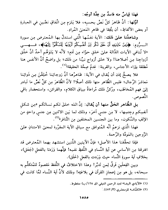 فلا يصحُّ إذن أن يُقال في الآية: ظاهرُها أنَّ زوجاتِنا خُلِقْنَ مِن ذَواتِنا مَعاشرَ الرِّجال؛ فليس الظَّاهر منها ذلك أصلًا! لأنَّ الظَّاهرَ مِن كلِّ نَصٍّ ما تَبادر إلى فهم المُخاطَب، ورُكنُ ذلك مُراعاةُ سِياق الكلام، والقرائن، واستحضار باقي النُّصوص.