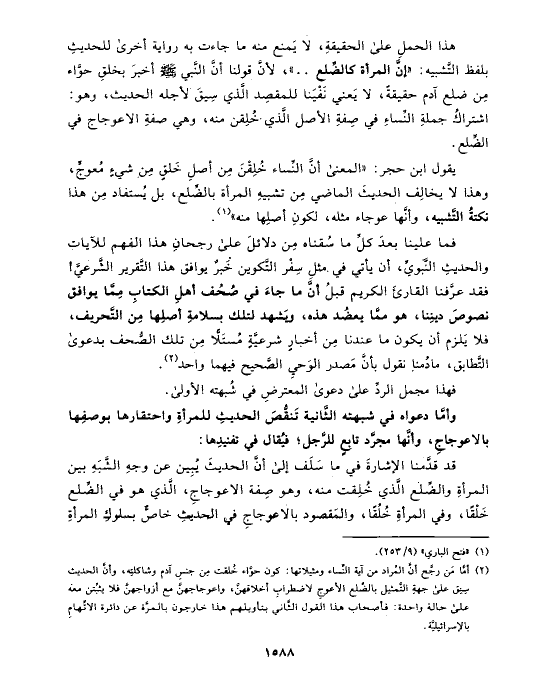 (¬٢) أمَّا مَن رجَّح أنَّ المُراد من آية النِّساء ومثيلاتها: كون حوَّاء خُلقت مِن جنسِ آدم وشاكلتِه، وأنَّ الحديث سِيق على جهةِ التَّمثيل بالضِّلع الأعوجِ لاضطرابِ أخلاقهنَّ، واعوجاجهنَّ مع أزواجهنَّ فلا يثبُتن معه على حالة واحدة: فأصحاب هذا القول الثَّاني بتأويلهم هذا خارجون بالمرَّة عن دائرة الاتِّهامِ بالإسرائيليَّة.