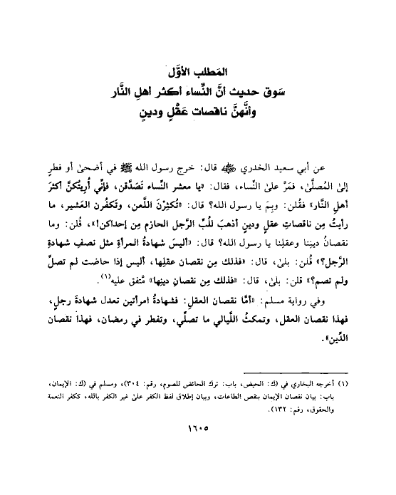 عن أبي سعيد الخدري رضي الله عنه قال: خرج رسول الله صلى الله عليه وسلم في أضحى أو فطرٍ إلى المُصلَّى، فمَرَّ على النِّساء، فقال: «يا معشر النِّساء تَصَدَّقن، فإنِّي أُرِيتُكنَّ أكثرَ أهلِ النَّار» فقُلن: وبِمَ يا رسول الله؟ قال: «تُكثِرْنَ اللَّعن، وتَكفُرن العَشير، ما رأيتُ مِن ناقصاتِ عقلٍ ودينٍ أذهبَ للُبِّ الرَّجل الحازم مِن إحداكن!»، قُلن: وما نقصانُ دينِنا وعقلِنا يا رسول الله؟ قال: «أليسَ شهادةُ المرأةِ مثل نصفِ شهادةِ الرَّجل؟» قُلن: بلى، قال: «فذلك مِن نقصان عقلِها، أليس إذا حاضت لم تصلِّ ولم تصم؟» قلن: بلى، قال: «فذلك مِن نقصانِ دينِها» مَّتفق عليه (¬١).