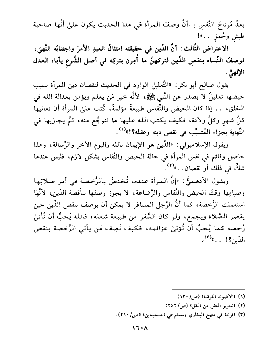 ويقول الأدهميُّ: «إنَّ المرأة عندما تُختصُّ بالرُّخصة في أمر صلاتِها وصيامِها وقتَ الحيض والنِّفاس والرَّضاعة، لا يجوز وصفها بناقصة الدِّين، لأنَّها استعملت الرُّخصة، كما أنَّ الرَّجل المسافر لا يمكن أن يوصف بنقص الدِّين حين يقصر الصَّلاة ويجمع، ولو كان السَّفر من طبيعة شغله، فالله يُحبُّ أن تُأتى رُخصه كما يُحبُّ أن تُؤتى عزائمه، فكيف نَصِف مَن يأتي الرُّخصة بنقص الدِّين؟! .. » (¬٣).