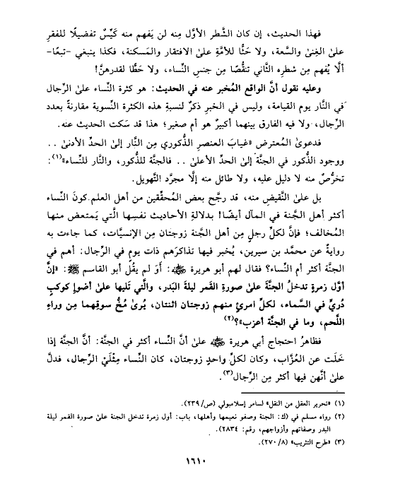 بل على النَّقيضِ منه، قد رجَّح بعض المُحقِّقين من أهل العلم كونَ النِّساء أكثر أهل الجَّنة في المآل أيضًا! بدلالةِ الأحاديث نفسِها الَّتي يَمتعض منها المُخالف؛ فإنَّ لكلِّ رجلٍ مِن أهل الجَّنة زوجتان مِن الإنسيَّات، كما جاءت به روايةٌ عن محمَّد بن سيرين، يُخبر فيها تذاكرَهم ذات يومٍ في الرِّجال: أهم في الجنَّة أكثر أم النِّساء؟ فقال لهم أبو هريرة رضي الله عنه: أَوَ لم يقُل أبو القاسم صلى الله عليه وسلم: «إنَّ أوَّل زمرةٍ تدخلُ الجنَّةَ على صورةِ القَمر ليلةَ البَدر، والَّتي تَليها على أضوإِ كوكبٍ دُريٍّ في السَّماء، لكلِّ امرئٍ منهم زوجتان اثنتان، يُرى مُخُّ سوقِهما مِن وراءِ اللَّحم، وما في الجنَّة أعزب»؟ (¬٢)