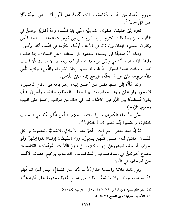نعود إلى حديثنا، فنقول: لقد بيَّن النَّبي صلى الله عليه وسلم للنِّساء وجهَ أكثريَّةِ نوعهنَّ في النَّار، حين رَبط ذلك بكثرةِ إتيانِه لمُوجِبَتين مِن مُوجباتِ العذاب، هما اللَّعن وكفران العشيرِ، فهذان وإنْ كانا في الرِّجال أيضًا، لكنَّهما في النِّساء أكثر وأظهر.