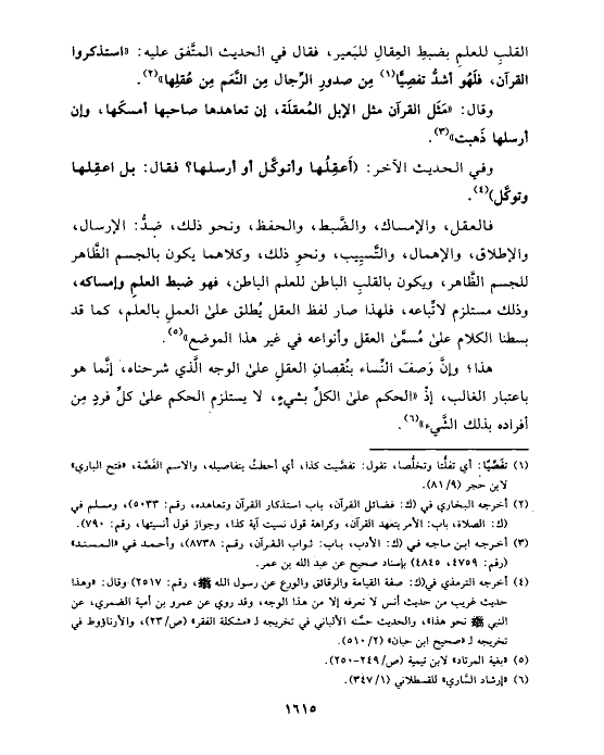 القلبِ للعلمِ بضبطِ العِقالِ للبَعير، فقال في الحديث المتَّفق عليه: «استذكروا القرآن، فلَهُو أشدُّ تفصِيًّا (¬١) مِن صدورِ الرِّجال مِن النَّعَم مِن عُقلِها» (¬٢).