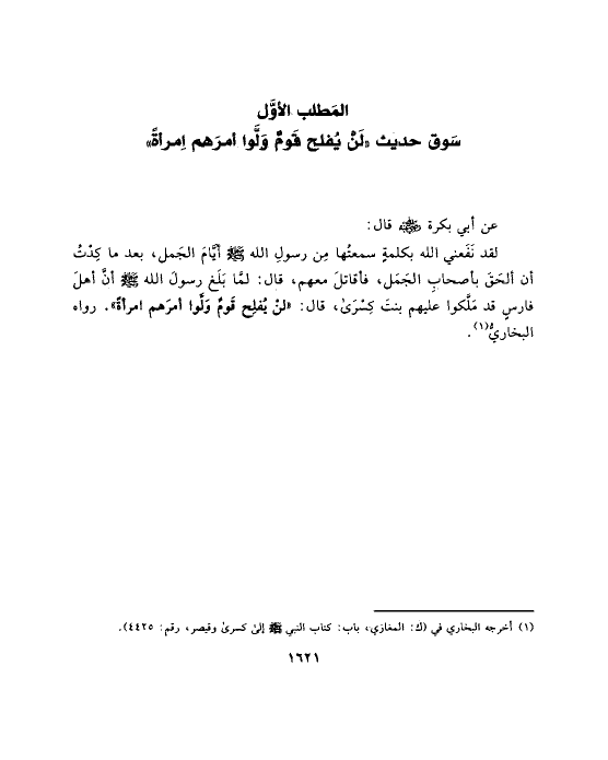 سَوق حديث «لَنْ يُفلح قَومٌ وَلَّوا أمرَهم اِمرأةً»