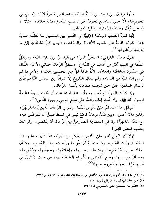 يقول محمَّد الغزاليُّ: «ستظلُّ المرأة هي اليد اليُسرى للإنسانيَّة، وسيظلُّ عملُها في البيتِ أكثرَ مِن عَملِها في الشَّارع، وسيظلُّ الرِّجالُ حمَّالي الأعباء الثِّقال في الشُّئون الخاصَّة والعامَّة، لأنَّ طاقةَ كلٍّ مِن الجنسين هكذا؛ ولأمرٍ ما لم يُرسل الله نبيَّةً مِن النِّساء، ولم يحكِ التَّاريخ إلَّا شواذًّا مِن الجنس النَّاعم قُمْن بأعمالٍ ضخمةٍ، على حين شُحِنت صفحاتُه بأسماءِ الرِّجال.