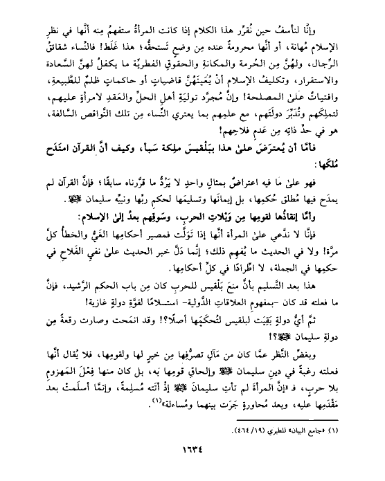 وإنَّا لنأسفُ حين نُقرِّر هذا الكلام إذا كانت المرأةُ ستفهمُ مِنه أنَّها في نظرِ الإسلام مُهانة، أو أنَّها محرومةٌ عنده مِن وضعٍ تَستحقُّه؛ هذا غَلَط! فالنِّساء شقائقُ الرِّجال، ولهُنَّ مِن الحُرمة والمكانةِ والحقوقِ الفطريِّة ما يكفلُ لهنَّ السَّعادة والاستقرار، وتكليفُ الإسلام أنْ يُعَينَهُنَّ قاضياتٍ أو حاكماتٍ ظلمٌ للطَّبيعةِ، وافتياتٌ على المصلحة! وإنَّ مُجرَّد توليَةِ أهلِ الحلِّ والعَقدِ لامرأةٍ عليهم، لتملِكَهم وتُدَبِّرَ دولَتَهم، مع علمِهم بما يعتري النِّساء مِن تلك النَّواقص السَّالفة، هو في حدِّ ذاتِه مِن عَدمِ فلاحِهم!