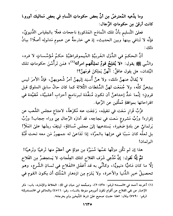 (¬١) أخرجه أحمد في «المسند» (رقم: ٢٠٤٣٨)، وصحَّحه ابن حبان في (ك: الخلافة والإمارة، باب: ذكر الإخبار عن نفي الفلاح عن أقوام تكون أمورهم منوطة بالنساء، رقم: ٤٥١٦) والحاكم في «المستدرك» (رقم: ٧٧٩٠) وقال: «هذا حديث صحيح على شرط الشَّيخين ولم يخرجاه».