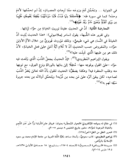 ويقول (إبراهيم المَطرودي) (¬٣): «إنَّ الحديثَ يجعلُ الذَّنبَ الَّذي وَقَعت فيه حوَّاء -على القولِ بوقوعِه منها- مُنتقِلًا إلى بناتِها بالوراثةِ ونزعِ العِرق، مع توبتِها منه وطلبِ المغفرة فيه! وهكذا يضطَرُّنا الحديث للقولِ بأنَّ الله تعالى يَغفرُ الذَّنبَ لصاحبِه، لكن يبقى أثرُه على مَن بعده مِن ذُرِّيته! ويَتَحمَّل أولادُه مِن بعده جريرةَ سَبْقِه لهم به!» (¬٤).