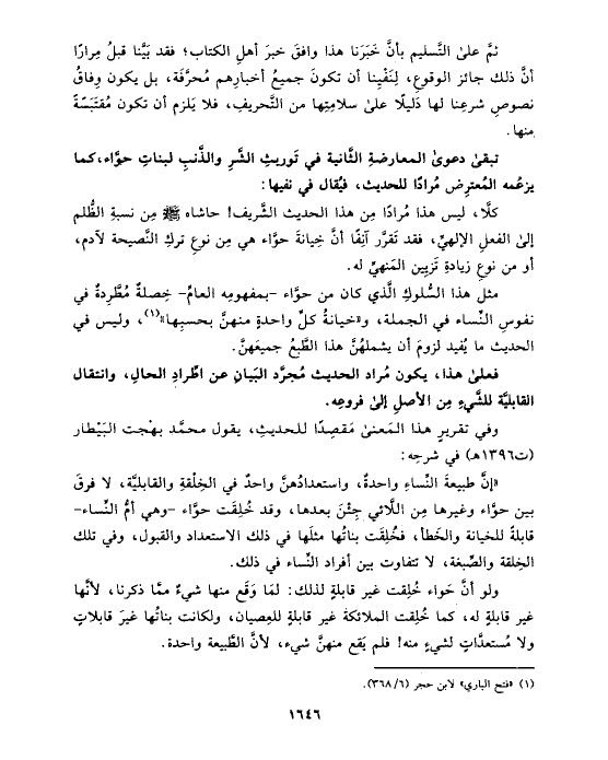 «إنَّ طبيعةَ النِّساءِ واحدةٌ، واستعدادُهنَّ واحدٌ في الخِلْقةِ والقابليَّة، لا فرقَ بين حوَّاء وغيرها مِن اللَّائي جِئْنَ بعدها، وقد خُلِقَت حوَّاء -وهي أمُّ النِّساء- قابلةً للخيانة والخَطأ، فخُلِقَت بناتُها مثلَها في ذلك الاستعداد والقبول، وفي تلك الخِلقة والصِّبغة، لا تتفاوت بين أفراد النِّساء في ذلك.