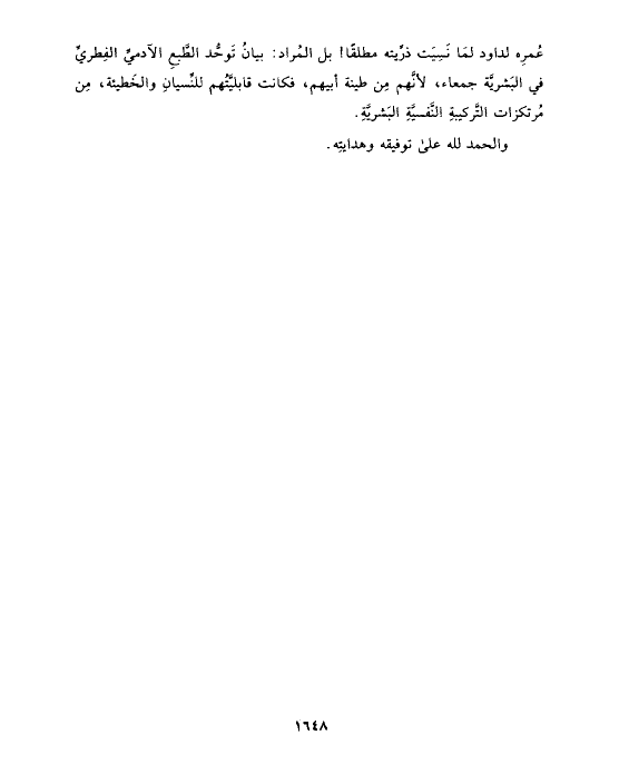 عُمرِه لداود لمَا نَسِيَت ذرِّيته مطلقًا! بل المُراد: بيانُ تَوحُّد الطَّبعِ الآدميِّ الفِطريِّ في البَشريَّة جمعاء، لأنَّهم مِن طينة أبيهم، فكانت قابليَّتُهم للنِّسيانِ والخَطيئة، مِن مُرتكزات التَّركيبةِ النَّفسيَّةِ البَشريَّةِ.