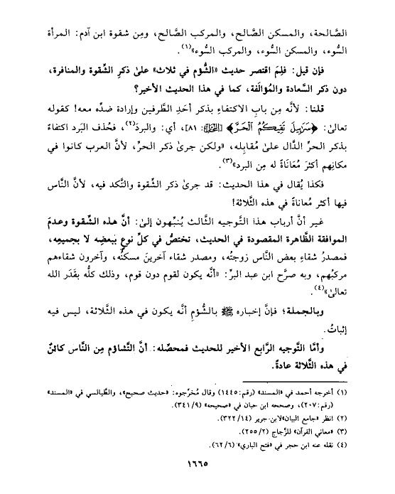 غير أنَّ أرباب هذا التَّوجيه الثَّالث يُنبِّهون إلى: أنَّ هذه الشِّقوة وعدمَ الموافقة الظَّاهرة المقصودة في الحديث، تختصُّ في كلِّ نوعٍ ببعضِه لا بجميعِه، فمصدرُ شقاءِ بعض النَّاس زوجتُه، ومصدر شقاء آخرينَ مسكنُه، وآخرون شقاءهم مركبُهم، وبه صرَّح ابن عبد البرِّ: «أنَّه يكون لقوم دون قوم، وذلك كلُّه بقَدَر الله تعالى» (¬٤).