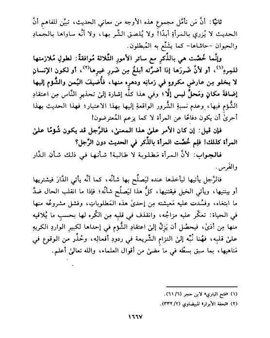 ثانيًا: أنَّ مَن تأمَّل مجموعِ هذه الأوجه من معاني الحديث، تبيَّن للفاهمِ أنَّ الحديث لا يُزري بالمرأةِ أبدًا! ولا يُلصق الشَّر بها، ولا أنَّه ساواها بالجمادِ والحيوان -حاشاها- كما يشَنِّع به المُبطلون.