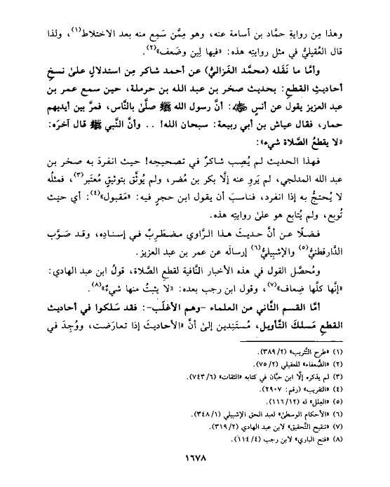 وأمَّا ما نَقَله (محمَّد الغَزاليُّ) عن أحمد شاكر مِن استدلالٍ على نسخِ أحاديثِ القطعِ: بحديث صخر بن عبد الله بن حرملة، حين سمع عمر بن عبد العزيز يقول عن أنسٍ رضي الله عنه: أنَّ رسول الله صلى الله عليه وسلم صلَّى بالنَّاس، فمرَّ بين أيديهم حمار، فقال عياش بن أبي ربيعة: سبحان الله! .. وأنَّ النَّبي صلى الله عليه وسلم قال آخرَه: «لا يقطعُ الصَّلاة شيء»: