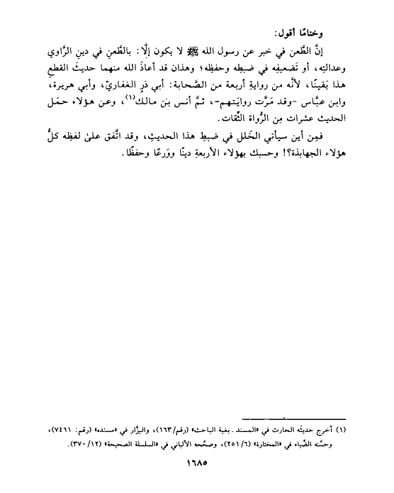 إنَّ الطَّعن في خبر عن رسول الله صلى الله عليه وسلم لا يكون إلَّا: بالطَّعنِ في دينِ الرَّاوي وعدالتِه، أو تَضعيفِه في ضبطِه وحفظِه؛ وهذان قد أعاذَ الله منهما حديثَ القطعِ هذا يَقينًا، لأنَّه من روايةِ أربعة من الصَّحابة: أبي ذرٍ الغفاريّ، وأبي هريرة، وابن عبَّاس -وقد مَرَّت روايَتهم-، ثمَّ أنس بن مالك (¬١)، وعن هؤلاء حمَل الحديث عشرات مِن الرُّواة الثِّقات.
