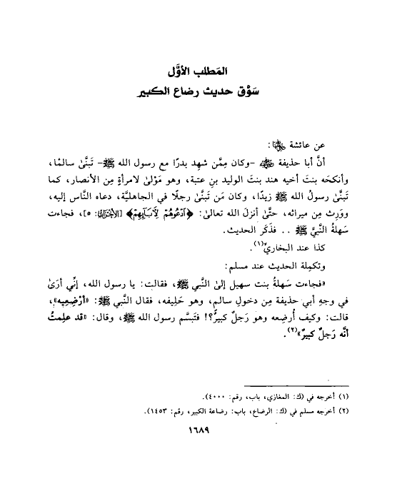 «فجاءت سَهلةُ بنت سهيل إلى النَّبي صلى الله عليه وسلم، فقالت: يا رسول الله، إنِّي أرَى في وجهِ أبي حذيفة مِن دخولِ سالمٍ، وهو حَلِيفه، فقال النَّبي صلى الله عليه وسلم: «أرْضِعِيه»، قالت: وكيف أُرضِعه وهو رَجلٌ كبيرٌ؟! فتَبسَّم رسول الله صلى الله عليه وسلم، وقال: «قد علِمتُ أنَّه رَجلٌ كبيرٌ» (¬٢).