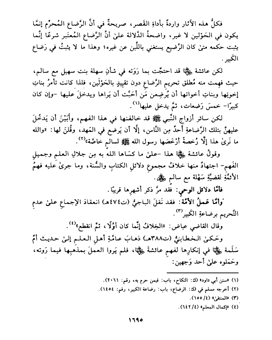 وقولُ عائشة رضي الله عنها هذا -على ما كسَاها الله به مِن جلالِ العلمِ وجميلِ الفَهمِ- اجتهادٌ منها خلافُ مجموعِ دلائلِ الكتابِ والسُّنة، وما جرى عليه فهمُ الأئمَّةِ لقضيَّةِ سَهْلة مع سالمٍ رضي الله عنهم.