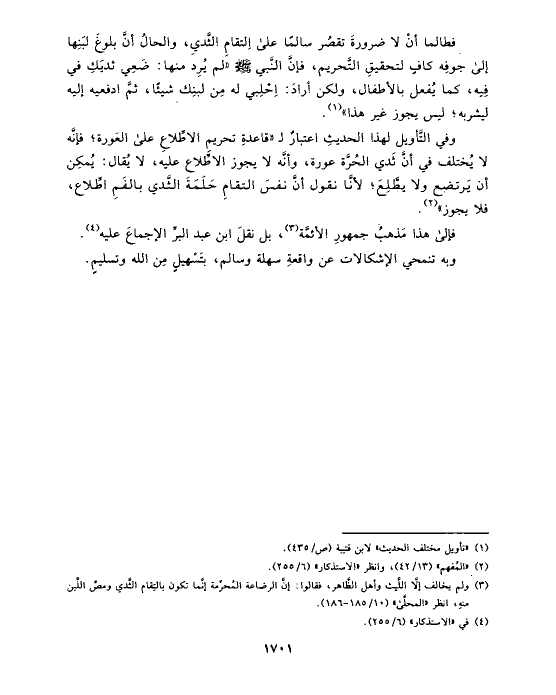 وفي التَّأويل لهذا الحديثِ اعتبارٌ لـ «قاعدةِ تحريمِ الاطِّلاعِ على العَورة؛ فإنَّه لا يُختلف في أنَّ ثَدي الحُرَّة عورة، وأنَّه لا يجوز الاطِّلاع عليه، لا يُقال: يُمكِن أن يَرتضع ولا يطَّلِعَ؛ لأنَّا نقول أنَّ نفسَ التقامِ حَلَمَةَ الثَّدي بالفَمِ اطِّلاع، فلا يجوز» (¬٢).