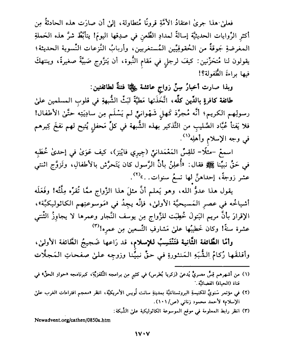 وأمَّا الطَّائفة الثَّانية فتَنْتَسِبُ للإسلامِ، قد رَاعها ضَجيجُ الطَّائفة الأولى، وأقلقَها رُكامُ الشُّبَهِ المَنثورةِ في حقِّ نبيِّنا وزوجِه على صفحاتِ المَجلَّات