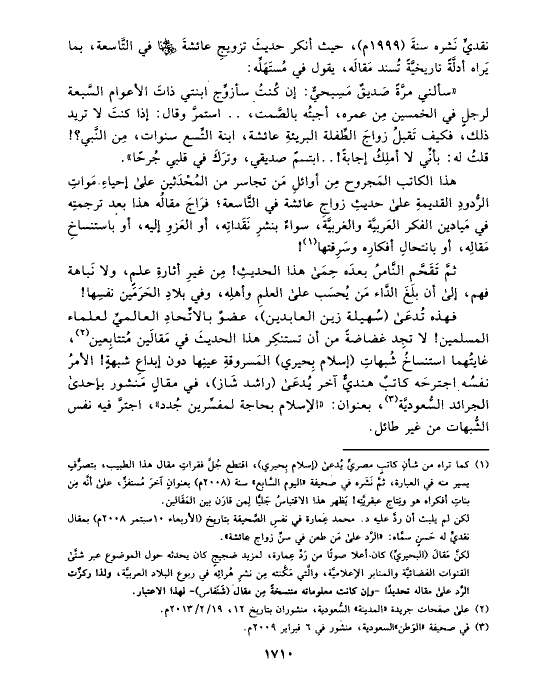 «سألني مرَّةً صَديقٌ مَسِيحيٌّ: إن كُنتُ سأزوِّج ابنتي ذاتَ الأعوام السَّبعة لرجلٍ في الخمسين مِن عمره، أجبتُه بالصَّمت، .. استمرَّ وقال: إذا كنتَ لا تريد ذلك، فكيف تَقبلُ زواجَ الطِّفلة البريئةِ عائشة، ابنة التِّسع سنوات، مِن النَّبي؟! قلتُ له: بأنِّي لا أملِكُ إجابةً! .. ابتسمً صديقي، وترَكَ في قلبي جُرحًا».