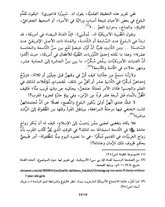 فلا يكاد ينقضي عَجَبي مِمَّن يَنتسِبُ إلى الإسلام، كيف له أن يُنكر زواجَ عائشة رضي الله عنها في التَّاسعة استبشاعًا منه لذلك؟ في الوقتِ الَّذي يُقِرُّ كُتَّاب الغَربِ بأنَّ زواج العَربيَّات في القديم مُبكِّرًا -في ما نعتبره اليوم سِنًّا للطُّفولة- أمر طَبيعيٌّ بحكمِ ظروف ذلك الزَّمان وعاداته؟!