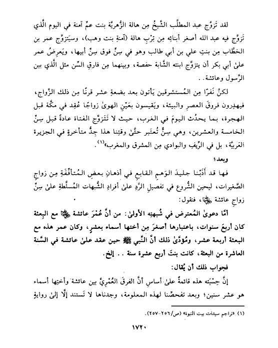 لكنَّ نَفرًا مِن المُستشرقين يَأتون بعد بضعةِ عشر قرنًا مِن ذلك الزَّواج، فيهدِرون فروقَ العصرِ والبيئة، ويَقيسون بعَيْنِ الهوى زواجًا عُقِد في مكَّة قبل الهجرة، بما يحدُث اليومَ في الغرب، حيث لا تَتَزوَّج الفتاة عادةً قبل سِنِّ الخامسة والعشرين، وهي سِنٌّ تُعتَبر حتَّى وقتِنا هذا جِدُّ متأخرةٍ في الجزيرة العَربيَّة، بل في الرِّيفِ والبوادي مِن المشرق والمغرب» (¬١).