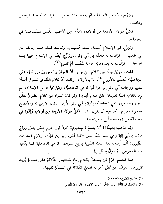 قلت: فبَيِّنٌ جدًّا مِن كلام ابن جريرٍ أنَّ الجارَ والمجرورَ في قولِه «في الجاهليَّة» مُتعلِّق بالأزواجِ (¬٢)، لا بالأولاد! وذلك أنَّ كلامَ الطَّبري مَسوق أصلًا لتَمييزِ زوجاتِ أبي بكرٍ إلى مَنْ كُنَّ له في الجاهليَّة، ومَنْ كُنَّ له في الإسلام، لم يُرِد بكلامِه البتَّة تعريجًا على ميلادِ أبناءِه! ولو كان المُراد من كلامِ الطَّبريُّ تعلُّقَ الجار والمجرور «في الجاهليَّة» بأولادِ أبي بكر الأُوَل، لكان الأوْلَى له والأفصح -وهو الفصيح النَّصيح- أن يقول: « .. فكلُّ هؤلاء الأربعة مِن أولادِه وُلِدُوا في الجاهليَّة مِن زَوجتيه اللَّتين سمَّيناهما».