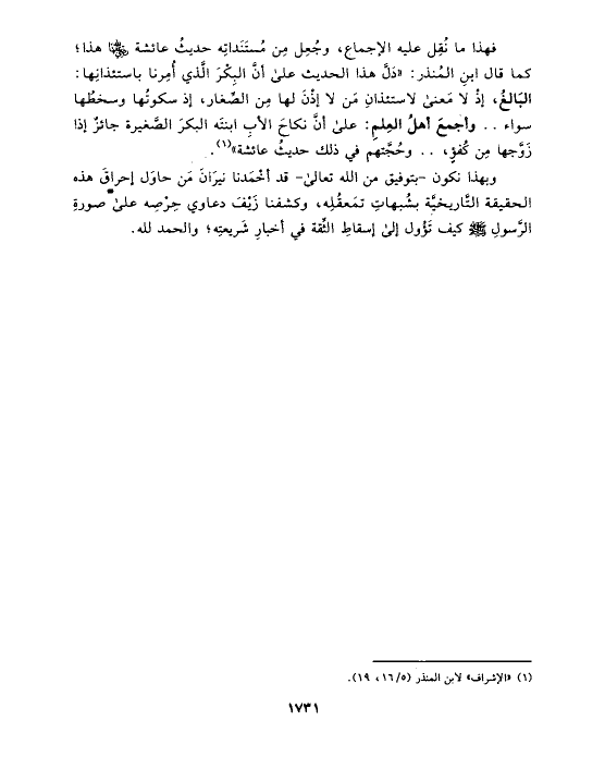 فهذا ما نُقِل عليه الإجماع، وجُعِل مِن مُستَنَداتِه حديثُ عائشة رضي الله عنها هذا؛ كما قال ابنِ المُنذر: «دَلَّ هذا الحديث على أنَّ البِكْرَ الَّذي أُمِرنا باستئذانِها: البَالغُ، إذْ لا مَعنى لاستئذانِ مَن لا إذْنَ لها مِن الصِّغار، إذ سكوتُها وسخطُها سواء .. وأجمعَ أهلُ العِلمِ: على أنَّ نكاحَ الأبِ ابنتَه البكرَ الصَّغيرة جائزٌ إذا زَوَّجها مِن كُفؤٍ، .. وحُجَّتهم في ذلك حديثُ عائشة» (¬١).