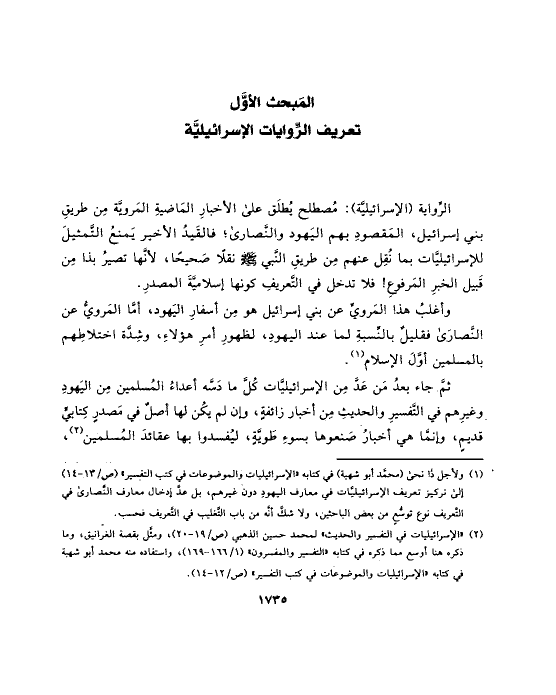 (¬١) ولأجل ذا نحى (محمَّد أبو شهبة) في كتابه «الإسرائيليات والموضوعات في كتب التفسير» (ص/١٣ - ١٤) إلى تركيز تعريف الإسرائيليَّات في معارف اليهودِ دون غيرهم، بل عدَّ إدخال معارف النَّصارى في التَّعريف نوع توسُّعٍ من بعض الباحثين، ولا شكَّ أنَّه من باب التَّغليب في التَّعريف فحسب.