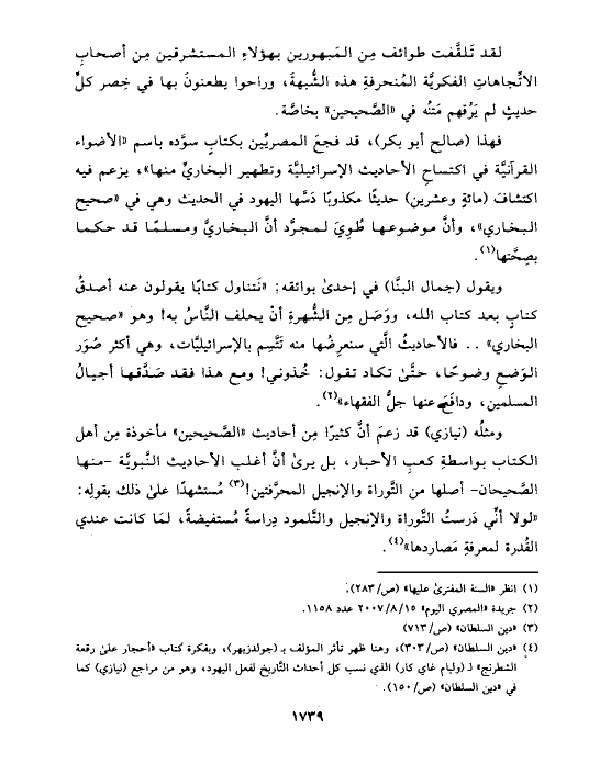 ومثلُه (نيازي) قد زعمَ أنَّ كثيرًا مِن أحاديث «الصَّحيحين» مأخوذة مِن أهل الكتاب بواسطةِ كعبِ الأحبار، بل يرى أنَّ أغلب الأحاديث النَّبويَّة -منها الصَّحيحان- أصلها من التَّوراة والإنجيل المحرَّفتين! (¬٣) مُستشهدًا على ذلك بقولِه: «لولا أنِّي دَرستُ التَّوراة والإنجيل والتَّلمود دِراسةً مُستفيضةً، لمَا كانت عندي القُدرة لمعرفةِ مَصاردها» (¬٤).