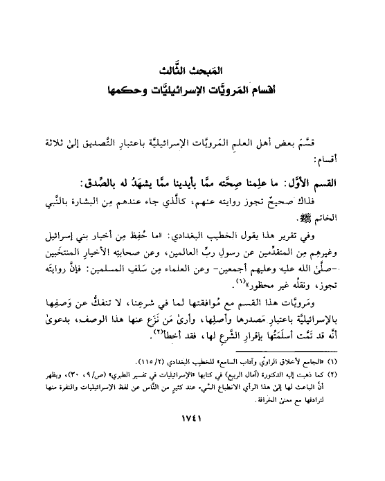 ومَرويَّات هذا القسم مع مُوافقتها لما في شرعِنا، لا تنفكُّ عن وَصفِها بالإسرائيليَّة باعتبارِ مَصدرها وأصلِها، وأرى مَن نَزَع عنها هذا الوصف، بدعوى أنَّه قد تَمَّت أسلَمَتُها بإقرارِ الشَّرعِ لها، فقد أخطأ (¬٢).