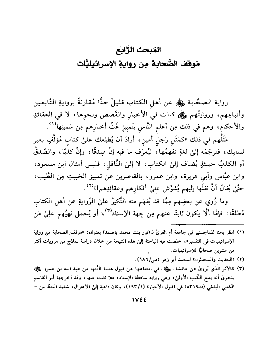 (¬١) انظر بحثا للماجستير في جامعة أم القرى لـ (نور بنت محمد باصمد) بعنوان: «موقف الصحابة من رواية الإسرائيليات في التفسير»، خلصت فيه الباحثة إلى هذه النتيجة من خلال دراسة نماذج من مرويات أكثر من عشرين صحابيًّا للإسرائيليات.