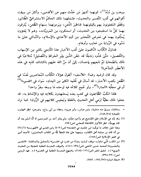 وقد كان (رشيد رضا) -للأسفِ- أطولَ هؤلاء الكُتَّاب المُعاصرين نَفسًا في الطَّعنِ بكعبِ الأحبار، قد أسالَ في ظُلمِه الكثيرَ مِن المِدادِ، سَواء في «تفسيرِه» (¬٢) أو في مجلَّتِه «المنار» (¬٣)، ولو جُمِع كلامُه فيه لوحده مَا وسِعَه سِفرٌ واحد!