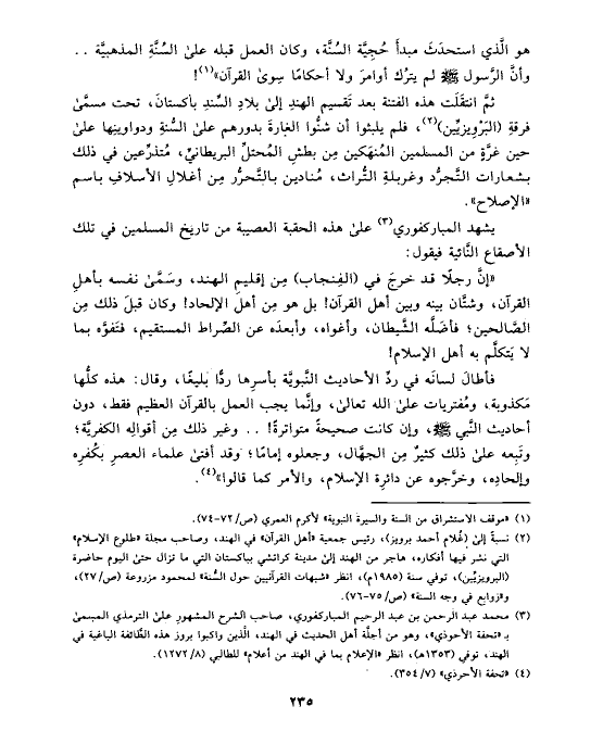 ثمَّ انتقَلَت هذه الفتنة بعد تَقسيم الهندِ إلى بلادِ السِّندِ باكستانَ، تحت مسمَّى فرقةِ (البَرْوِيزيِّين) (¬٢)، فلم يلبثوا أن شنُّوا الغارةَ بدورهم على السُّنةِ ودواوينِها على حين غرَّةٍ من المسلمين المُنهَكين مِن بطشِ المُحتلِّ البريطانيِّ، مُتذرِّعين في ذلك بشعارات التَّجرُّد وغربلةِ التُّراث، مُنادين بالتَّحرُّر مِن أغلالِ الأسلافِ باسم «الإصلاح».