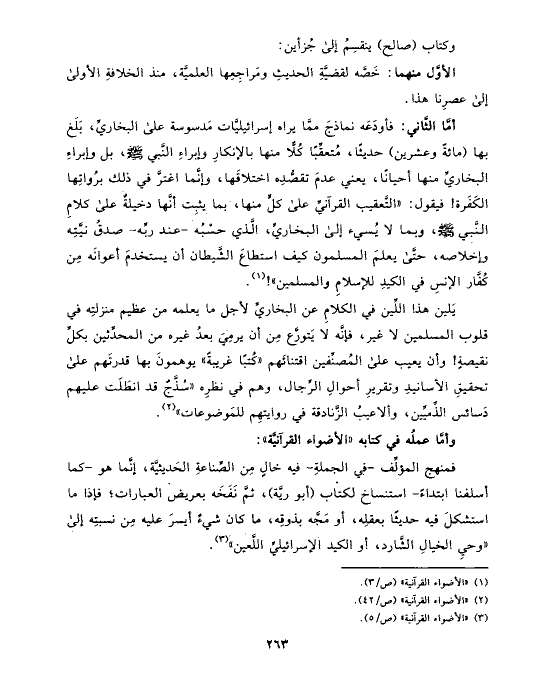 أمَّا الثَّاني: فأودَعَه نماذجَ ممَّا يراه إسرائيليَّات مَدسوسة على البخاريِّ، بَلَغ بها (مائةً وعشرين) حديثًا، مُتعقِّبًا كُلًّا منها بالإنكارِ وإبراءِ النَّبي صلى الله عليه وسلم، بل وإبراءِ البخاريِّ منها أحيانًا، يعني عدمَ تقصُّدِه اختلاقَها، وإنَّما اغترَّ في ذلك برُواتِها الكَفَرة! فيقول: «التَّعقيب القرآنيِّ على كلٍّ منها، بما يثبِت أنَّها دخيلةٌ على كلامِ النَّبي صلى الله عليه وسلم، وبما لا يُسيء إلى البخاريِّ، الَّذي حسْبُه -عند ربِّه- صدقُ نيَّتِه وإخلاصه، حتَّى يعلمَ المسلمون كيف استطاعَ الشَّيطان أن يستخدمَ أعوانَه مِن كُفَّار الإنسِ في الكيدِ للإسلامِ والمسلمين»! (¬١).