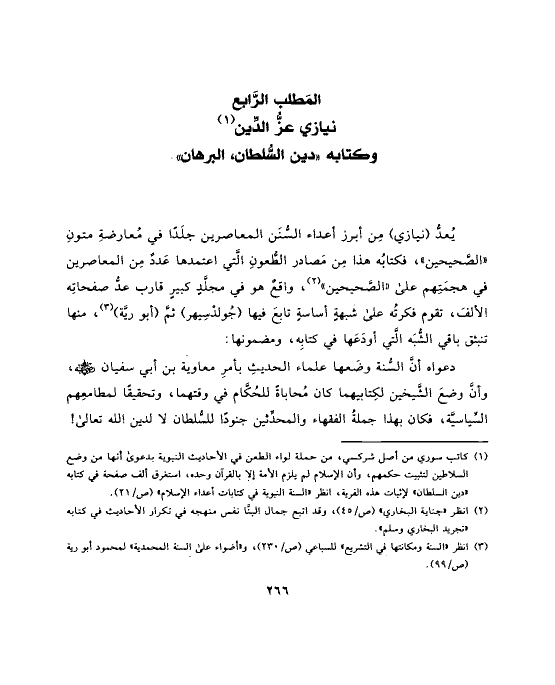 يُعدُّ (نيازي) مِن أبرز أعداء السُّنَن المعاصرين جلَدًا في مُعارضةِ متونِ «الصَّحيحين»، فكتابُه هذا مِن مَصادر الطُّعونِ الَّتي اعتمدها عَددٌ مِن المعاصرين في هجمَتِهم على «الصَّحيحين» (¬٢)، واقعٌ هو في مجلَّدٍ كبيرٍ قارب عدُّ صفحاتِه الألفَ، تقوم فكرتُه على شبهةٍ أساسةٍ تابعَ فيها (جُولدْسِيهر) ثمَّ (أبو ريَّة) (¬٣)، منها تنبثق باقي الشُّبَه الَّتي أودَعَها في كتابِه، ومضمونها: