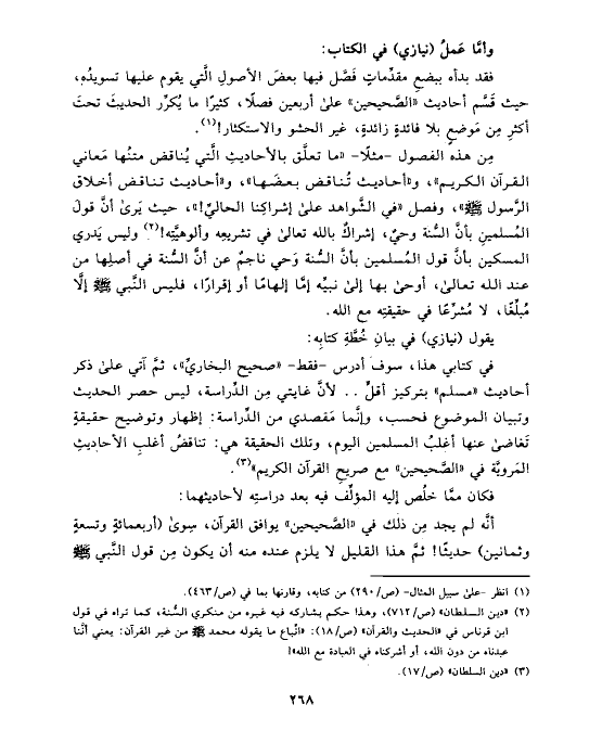 مِن هذه الفصول -مثلًا- «ما تعلَّق بالأحاديثِ الَّتي يُناقض متنُها مَعاني القرآن الكريم»، و «أحاديث تُناقض بعضَها»، و «أحاديث تناقض أخلاق الرَّسول صلى الله عليه وسلم»، وفصل «في الشَّواهد على إشراكِنا الحاليِّ!»، حيث يَرى أنَّ قولَ المُسلمينِ بأنَّ السُّنة وحيٌ، إشراكٌ بالله تعالى في تشريعِه وألوهيَّتِه! (¬٢) وليس يَدري المسكين بأنَّ قول المُسلمين بأنَّ السُّنة وَحي ناجمٌ عن أنَّ السُّنة في أصلِها من عند الله تعالى، أوحى بها إلى نبيِّه إمَّا إلهامًا أو إقرارًا، فليس النَّبي صلى الله عليه وسلم إلَّا مُبلِّغًا، لا مُشرِّعًا في حقيقتِه مع الله.