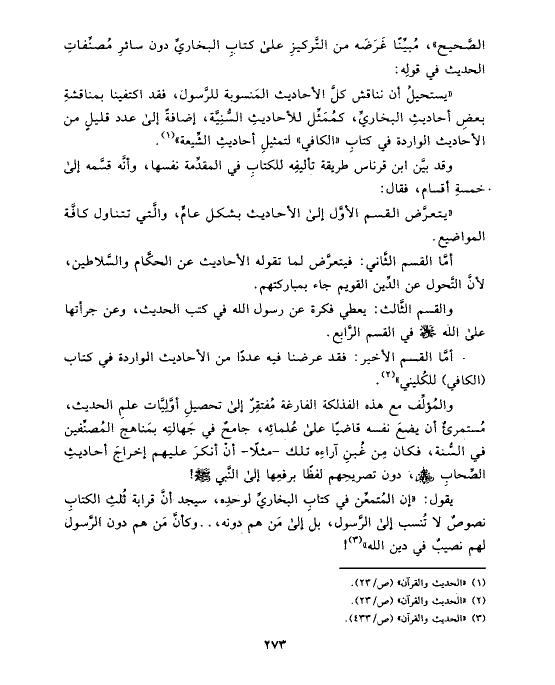«يستحيلُ أن نناقش كلَّ الأحاديث المَنسوبة للرَّسول، فقد اكتفينا بمناقشةِ بعضِ أحاديثِ البخاريِّ، كمُمَثِّل للأحاديثِ السُّنِيَّة، إضافةً إلى عدد قليلٍ من الأحاديث الواردة في كتابِ «الكافي» لتمثيلِ أحاديثِ الشِّيعة» (¬١).