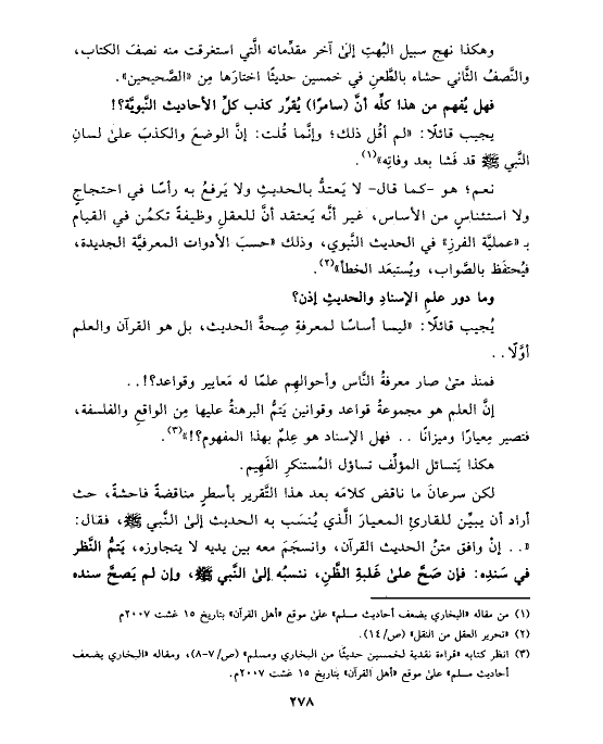 (¬٣) انظر كتابه «قراءة نقدية لخمسين حديثًا من البخاري ومسلم» (ص/٧ - ٨)، ومقاله «البخاري يضعف أحاديث مسلم» على موقع «أهل القرآن» بتاريخ ١٥ غشت ٢٠٠٧ م.
