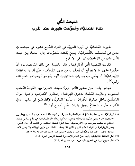 (¬١) ثيوقراطيَّة: تعني حكومة الكَهَنة، أو الحكومة الدِّينية، وتتكون هذا المصطلح من كلمتين يونانيتين مدمجتين: «ثيو» وتعني الدِّين، و «قراطية» وتعني: الحكم، وعليه فان الثيوقراطية هي نظام سياسي يستمد الحاكم فيه سلطته وشرعيته من الإله مباشرة، حيث تكون الطبقة الحاكمة من الكهنة أو رجال الدين، وتعتبر الثيوقراطية من أنواع الحكم الفردي الذي كان يحكمها الملك عن طريق الوراثة، ولا يجوز لأحد مخالفته باعتباره خليفة الله والمُتكلِّم باسمه، وانظر «معجم اللغة العربية المعاصرة» (١/ ٣٠٨).