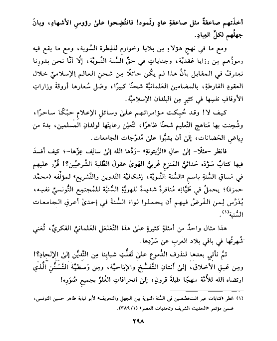 فانظر -مثلًا- إلى حالِ «الزَّيتونةِ» -رَدَّها الله إلى سالِف عِزِّها-؛ كيف أفسدَ فيها كتابٌ سَوَّدَه حَداثيُّ المَنزعِ غَربيُّ الهَوى عقولَ الطَّلبة الشَّرعيِّين؟! قُرِّر عليهم في مَساقِ السُّنةِ باسمِ «السُّنة النَّبويَّة، إشكاليَّة التَّدوين والتَّشريع» لمؤلِّفه (محمَّد حمزة)؛ يحملُ في طَيَّاتِه مُنافرةً شديدةً للهويَّةِ السُّنيَّة للمُجتمِع التُّونسيِّ نفسِه، يُدَرَّس لِمن الفَرضُ فيهم أن يحملوا لواءَ السُّنةَ في إحدى أعرقِ الجامعات السُّنية (¬١).